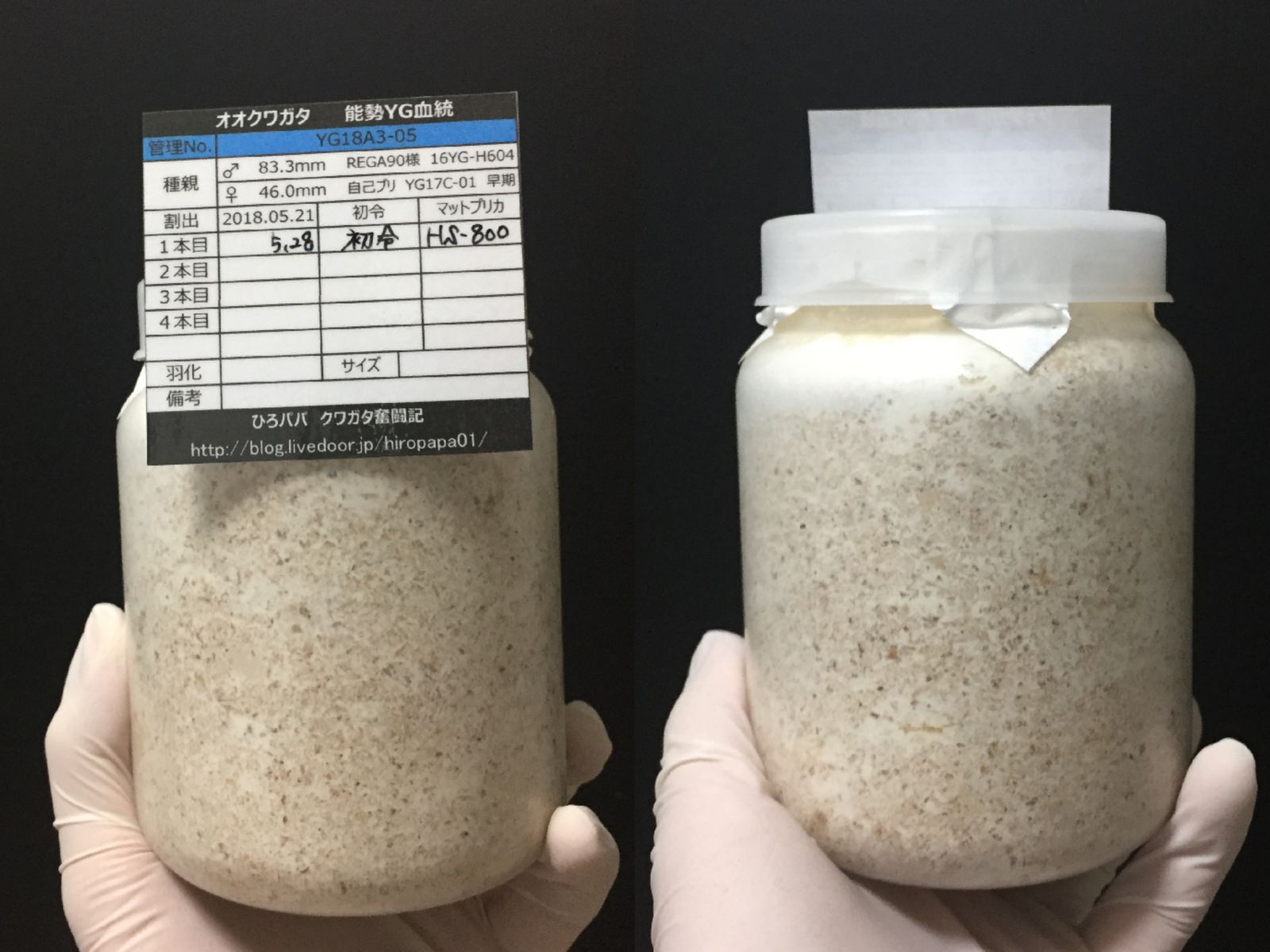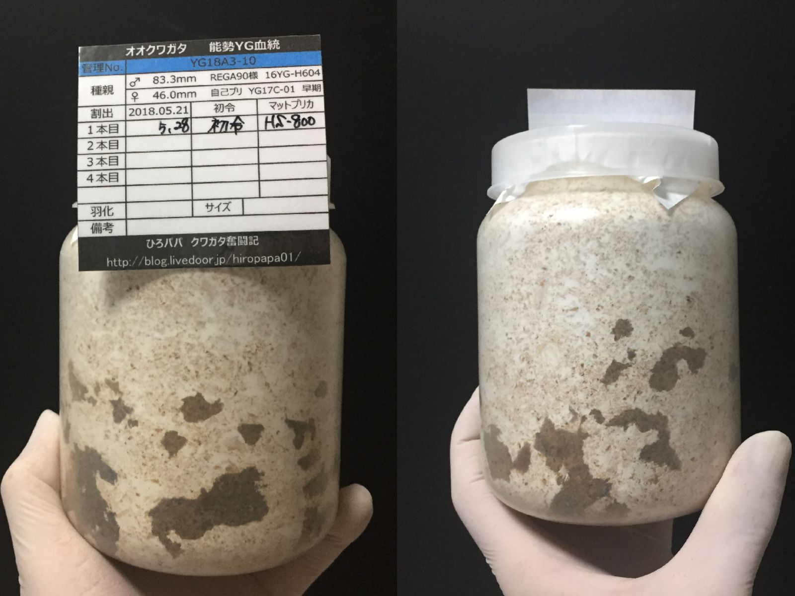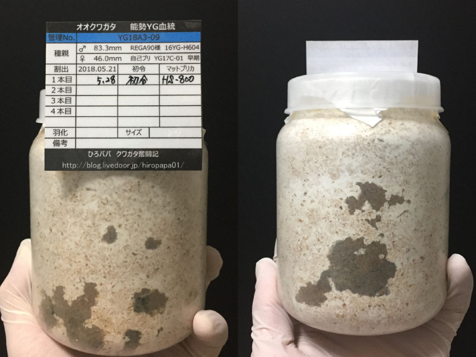 オガは飛び散るわ、菌糸の上面は汚れるわで大変でした・・・(;´Д`)