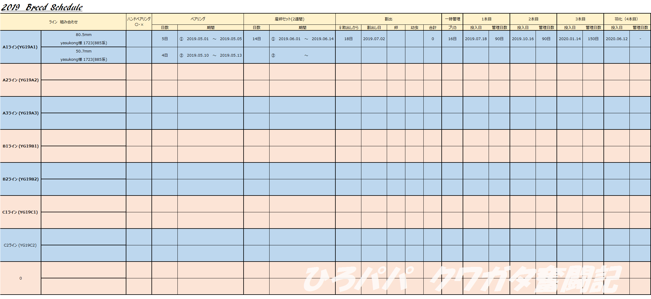 また、ペアリングから羽化までのベースも作っておこうとスケジュール管理表も作成しました。