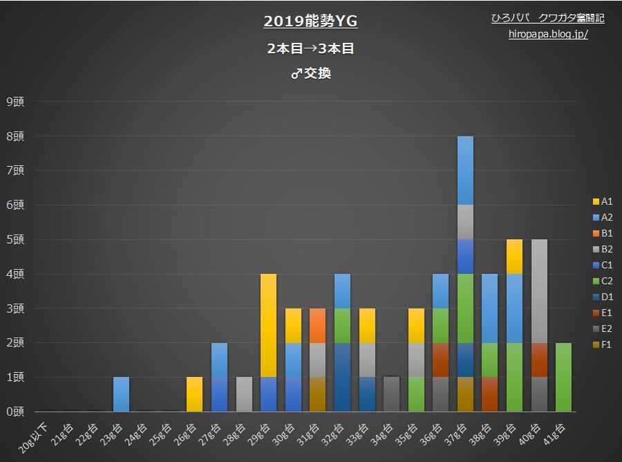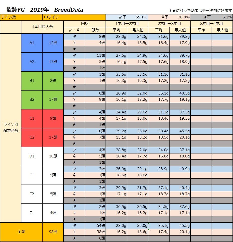 *アベレージや最大・最小体重の欄は、メスの早期羽化や★幼虫を含むのかどうか見てくださっている方に分かりにくい為消去しました。