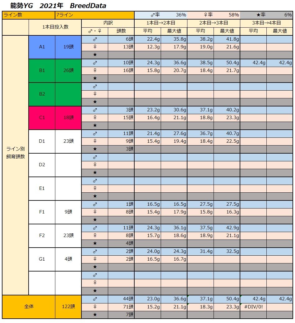 毎年♂40頭前後でこれくらいの経過が出るならば100頭ブリードが一番我が家には合っているのですがw、今年のデータはマグレに近い経過かと思いますので…