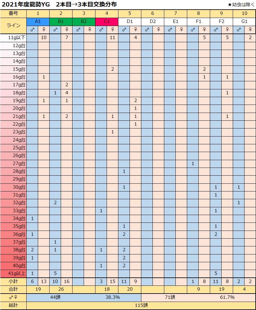 ♂1頭のみのF1ライン・3令投入になった補強G1幼虫を除き、各ラインアベレージは36~38g。