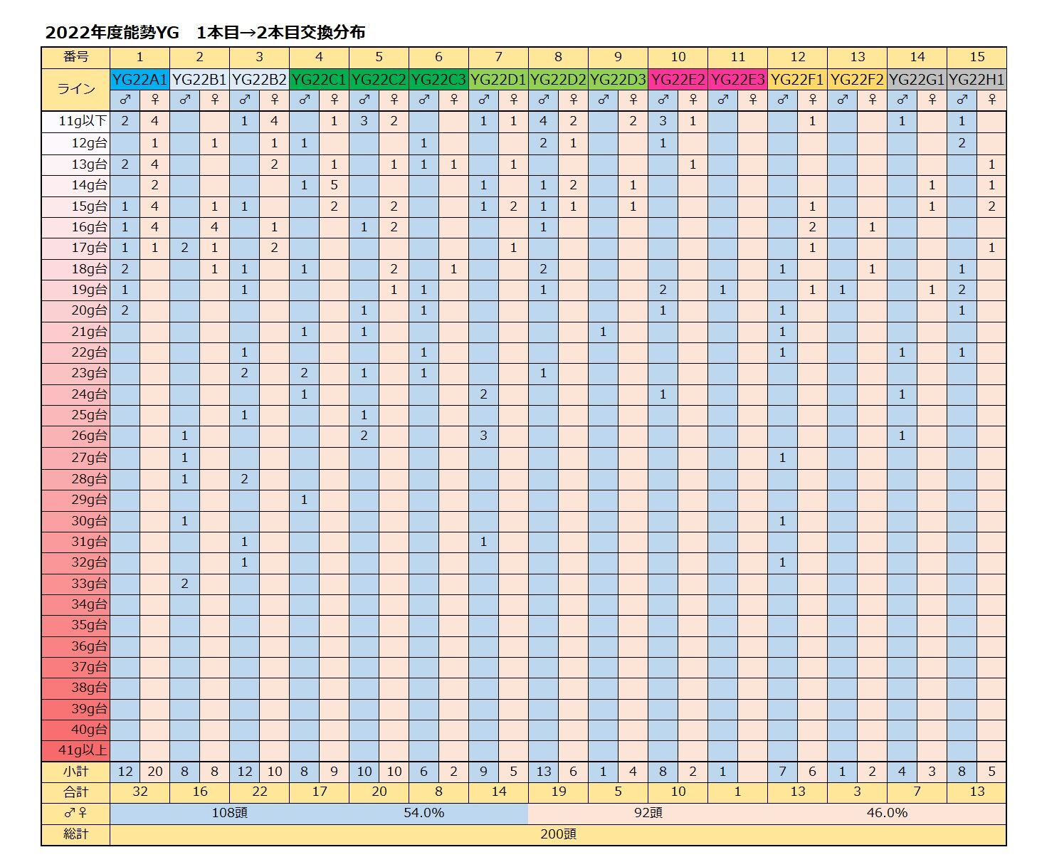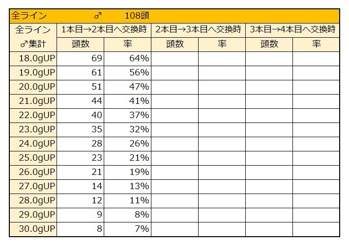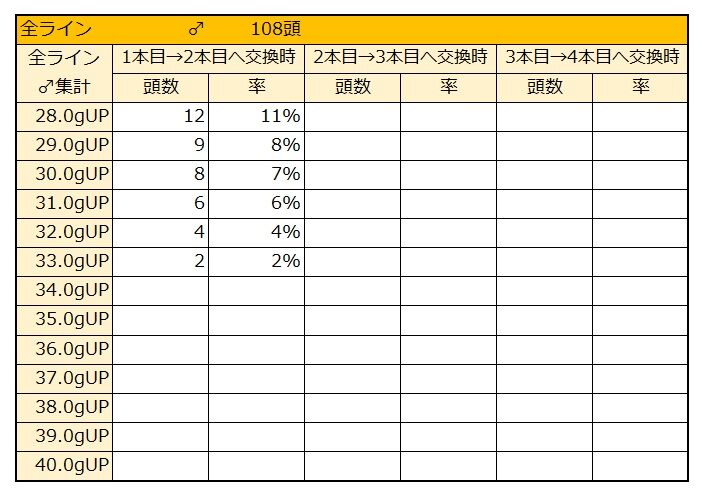 37gUPは40頭(37%)、40gUPは23頭(21%)となります。