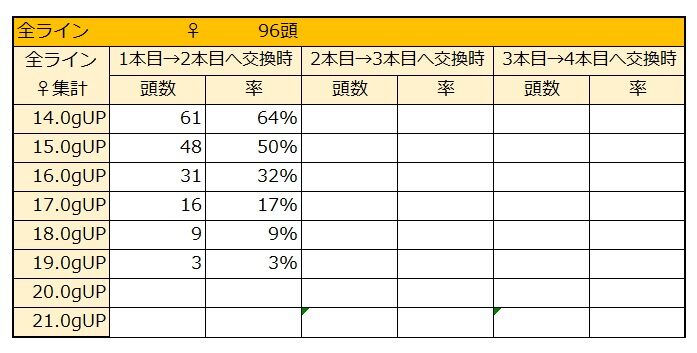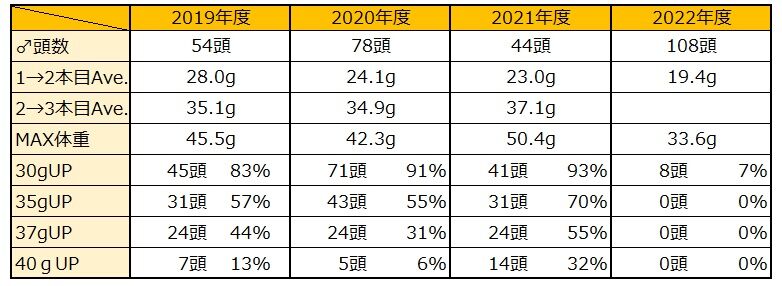 昨年よりも比率は落ちますが、管理頭数が増えていることから単純に40gUP頭数は過去最高となります。