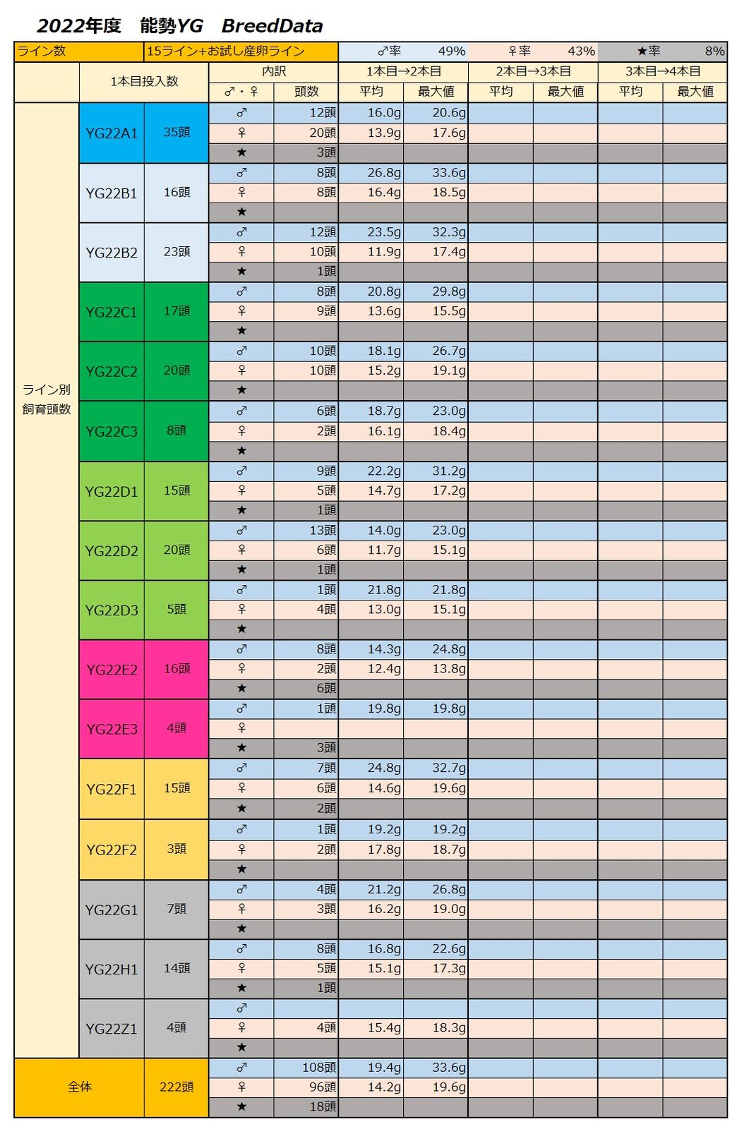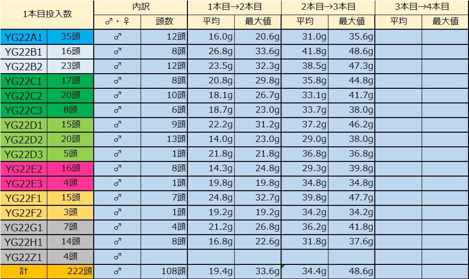 1本目投入数 222本(お試し産卵含)