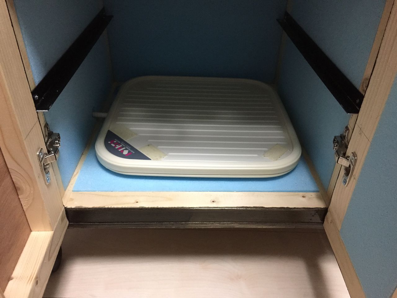 当初メタルラックとの一体化したものも検討しましたが、棚板は自由がきかなかったり、今後移動・改造がしにくいので保温庫をラックに載せる方法にしましたが、正解でした♪