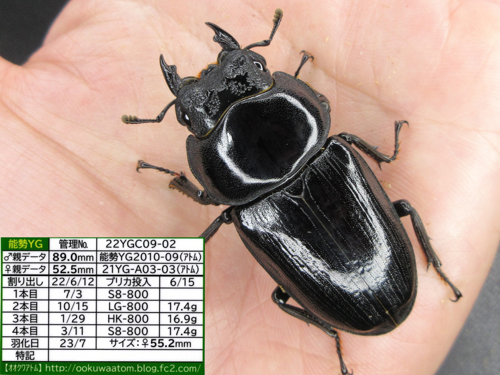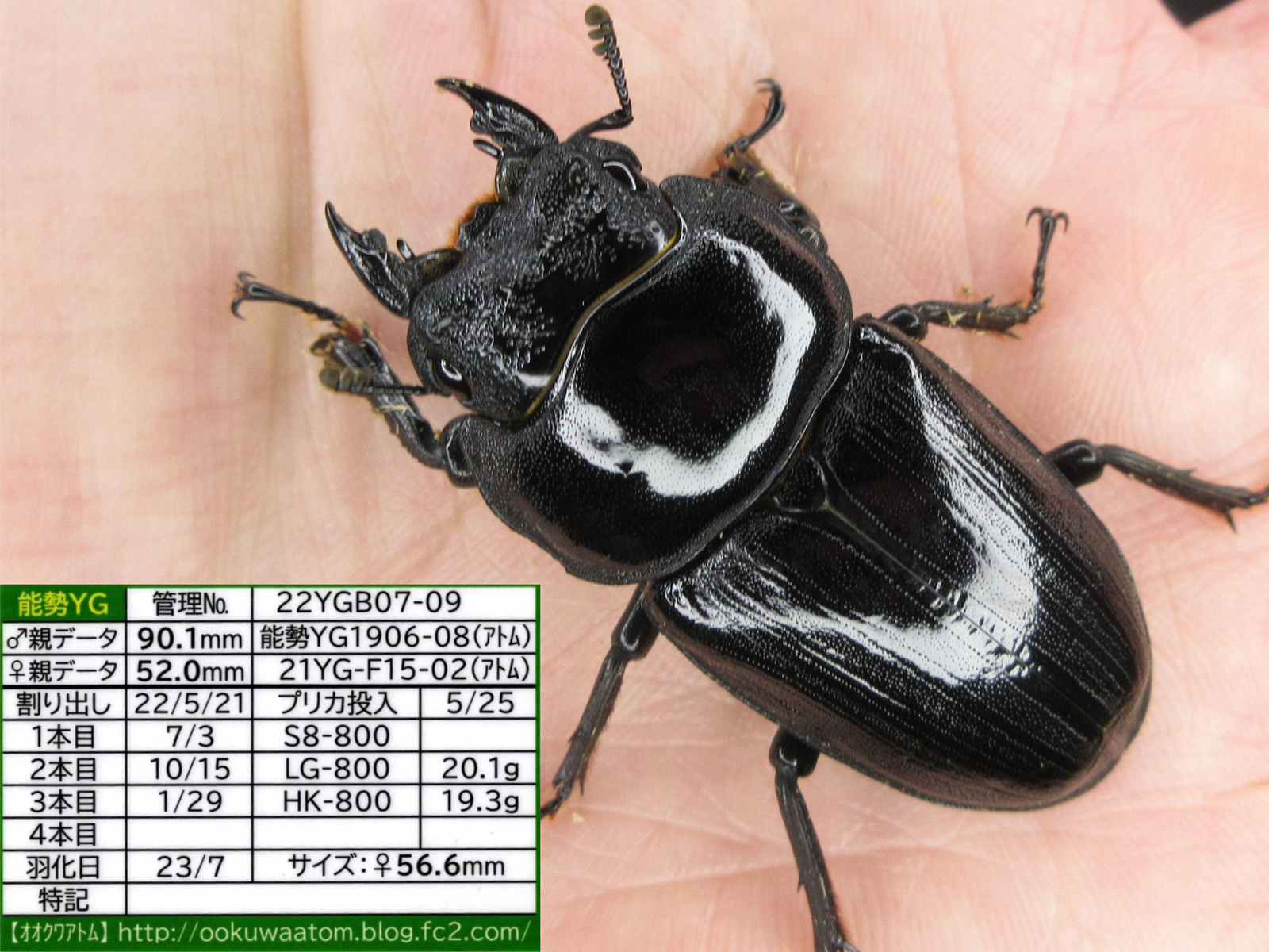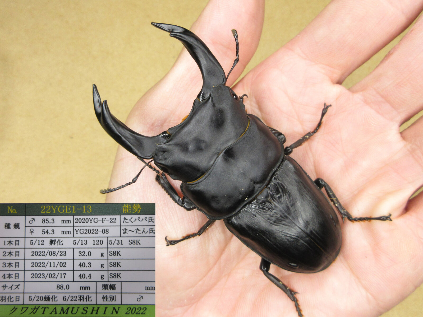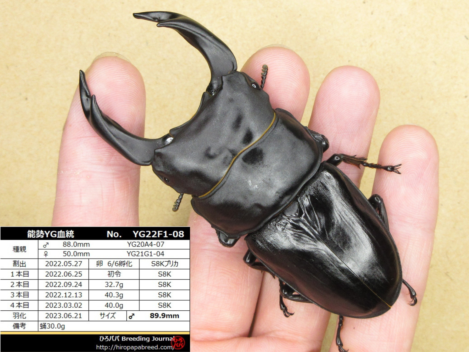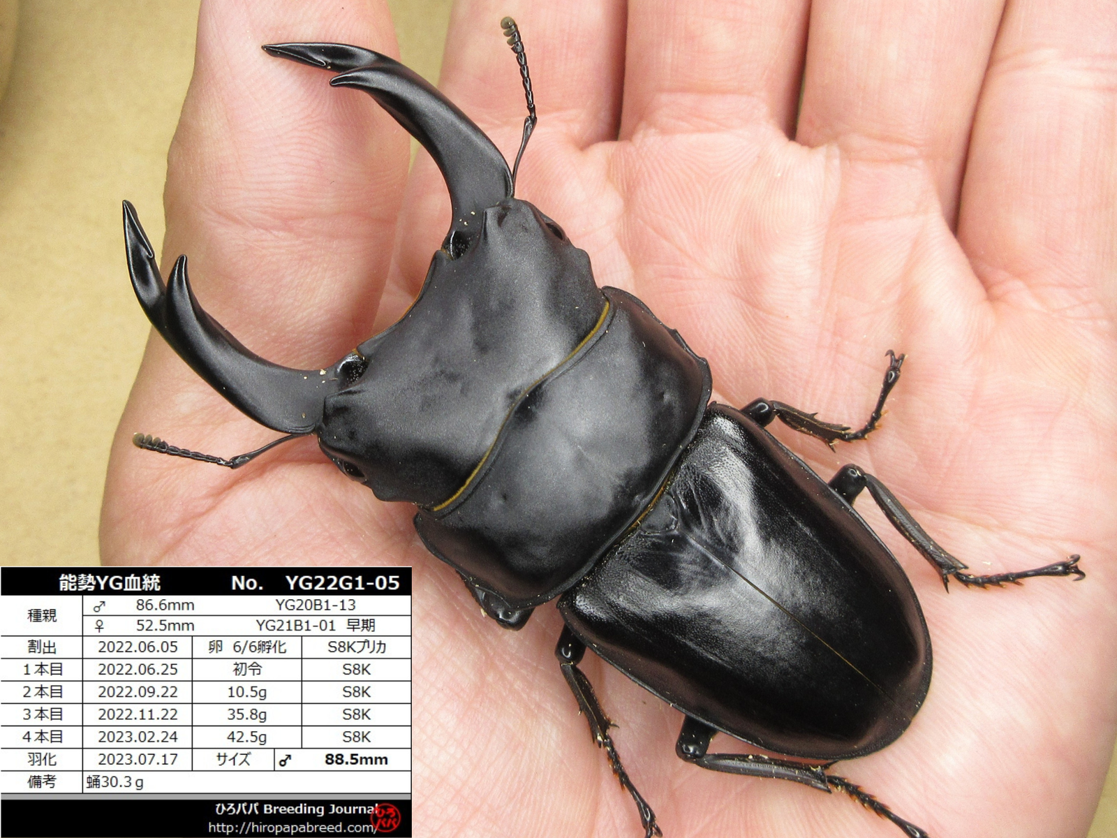 22G1ラインの♂は4頭でしたが、羽化結果は74.5mm(24.4g)・87.1mm(38.3g)・88.0mm(39.4g)・88.5mm(42.5g)と好成績。
