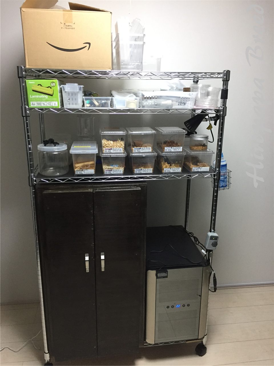 下段右上:発砲箱(早期羽化狙い・早期羽化個体管理)