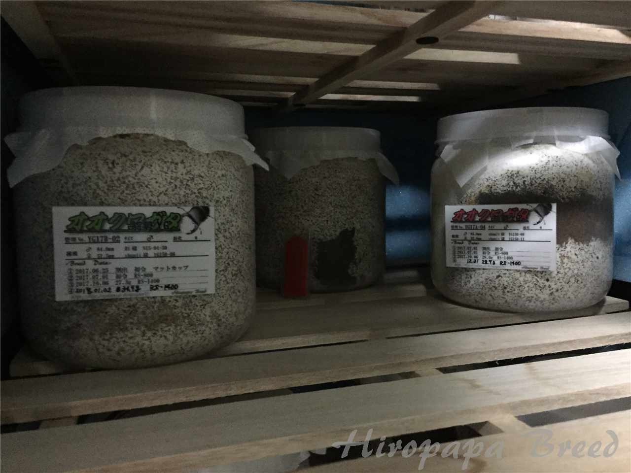 手前のすぐ目に付くところに最大幼虫のボトルがあったら触ってしまいます(笑)