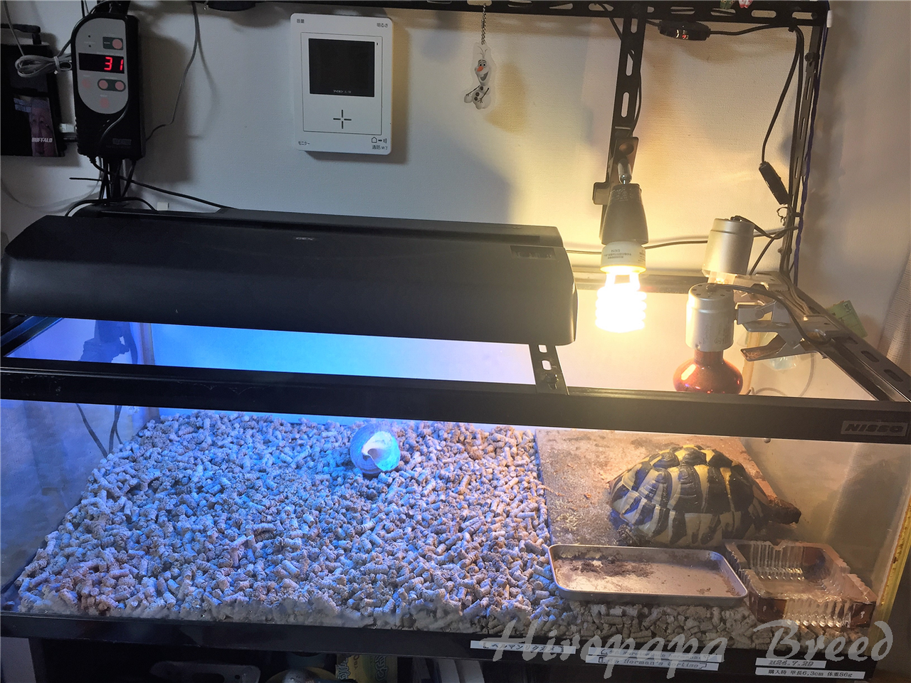リクガメちゃんにはバスキング・夜間用保温球・紫外線球・紫外線蛍光灯をサーモで温度管理+照明時間管理されてる(◎_◎;)